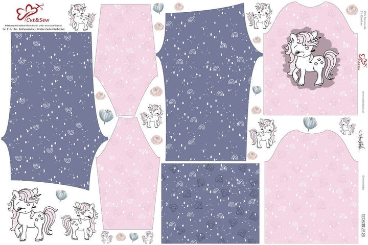 Mit den einzigartigen Stoffen von Cut&Sew musst du keine Schnittmuster mehr drucken, schneiden und kleben. Das Schnittmuster für das Kinder-Gute-Nacht-Set ist bereits auf dem Stoff aufgedruckt und du musst es nur noch ausschneiden und nähen. Zusätzlich brauchst du nur noch ca. 0,3m bis 0,5m farblich passendes Bündchen.
